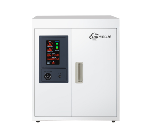 無隔膜次氯酸發生器制備消毒液流量大,每分鐘可以制備5L的微酸性次氯酸水消毒液,濃度可調,有臺式和立式兩種款式,外形簡約大方。采用的是無隔膜式電解槽,使用壽命達5000+小時,配合深藍智能消毒機器人可以持續的對食品廠的加工流水線等進行消毒殺菌。
